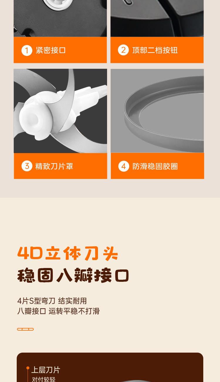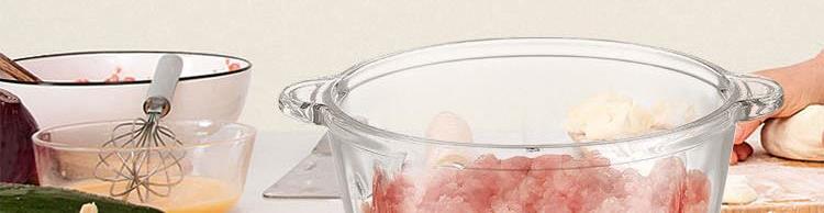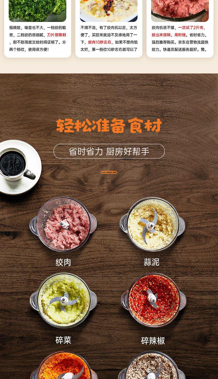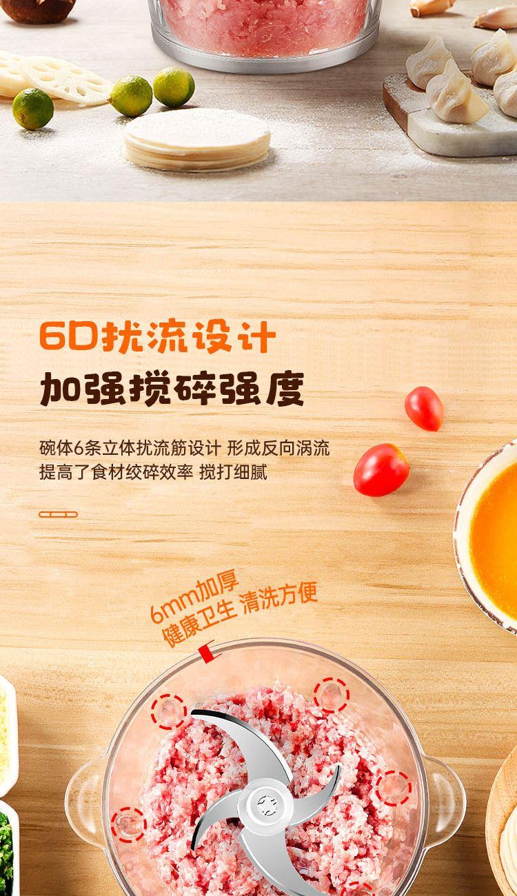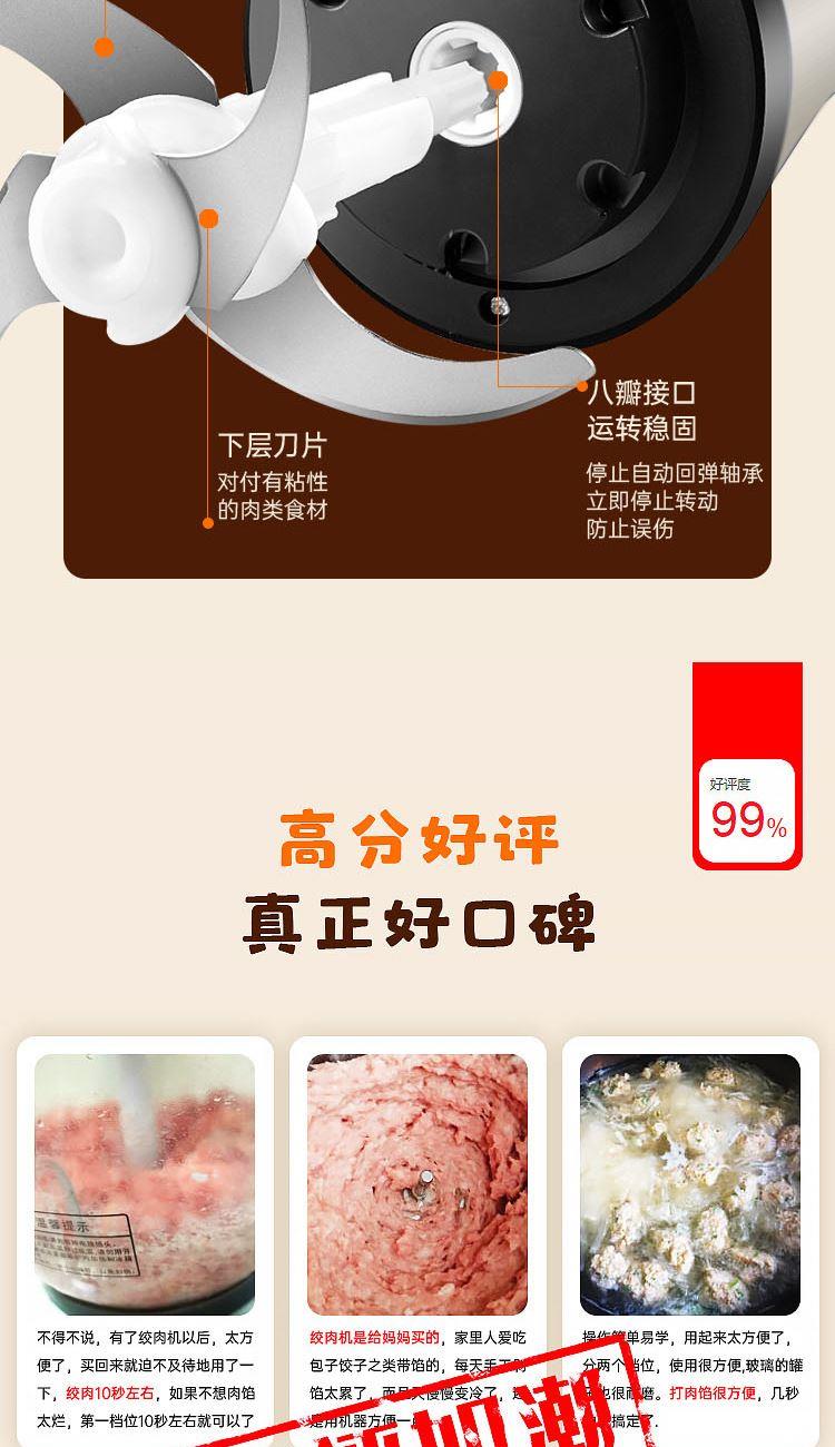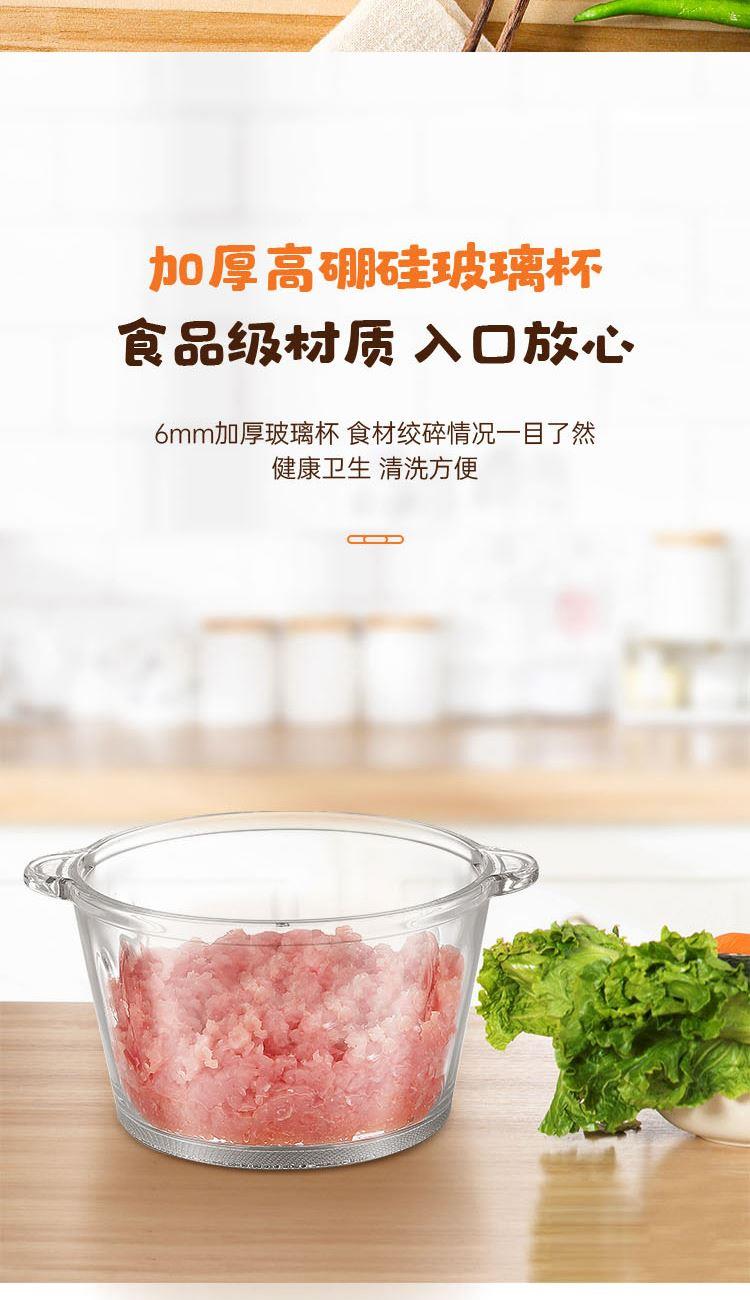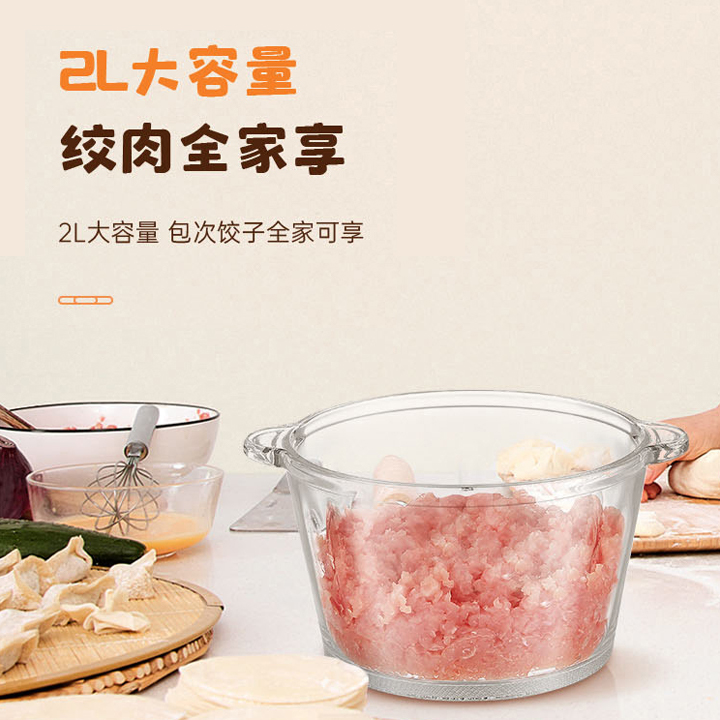 额定功率:300W 容 量:2L 杯体材质:玻璃 机头材质:不锈钢201 电机转速:8000r/min 包装尺寸:320*215*162mm 毛 重:1.95kg 装 箱 数:1台 2L大容量加厚玻璃杯,一次绞肉全家享 快慢双档设计,绞肉、剁陷、切碎、搅拌操作简单,随意切换 加厚高硼硅玻璃杯体,健康卫生,清洗更方便 产品拥有松手即停、电机过热等保护,使用更安全。